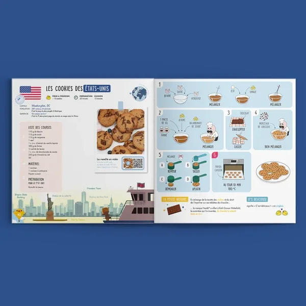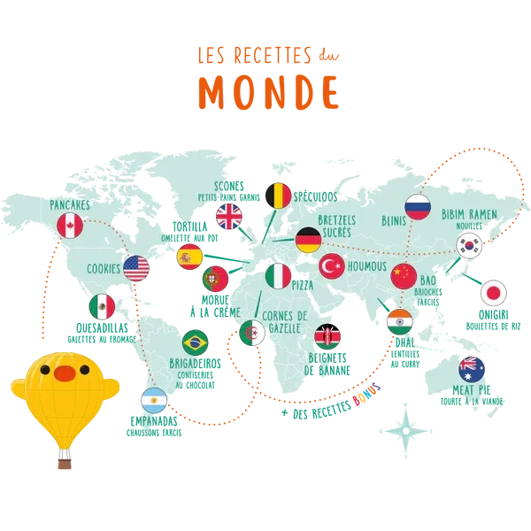 Découvrez le livre qui fera voyager vos enfants à la découverte des recettes emblématiques des 4 coins du Monde, toujours en s'amusant !