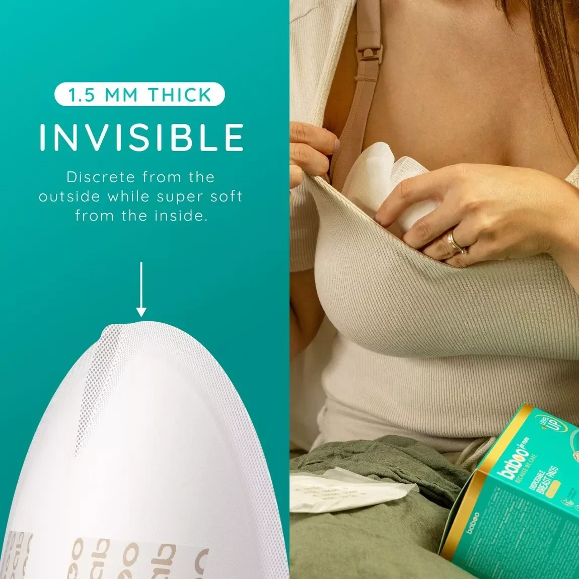 •Vous serez surprise d’apprendre que les coussinets BABOO® seront complètement invisibles sous vos vêtements, même lorsque vous portez le soutien-gorge le plus fin.