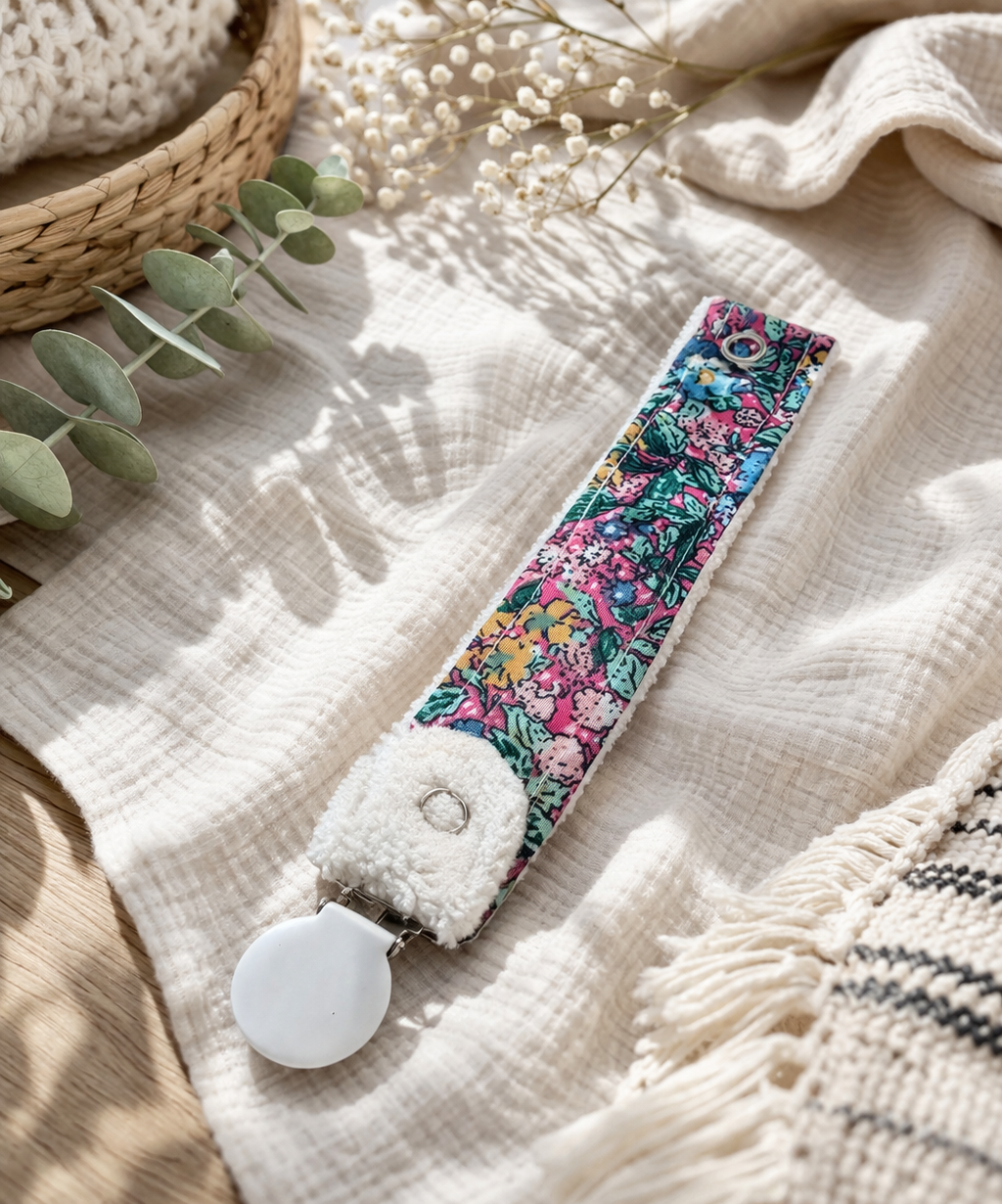 Craque pour cette attache tétine artisanale au motif fleuri, à la fois pratique et pleine de douceur.